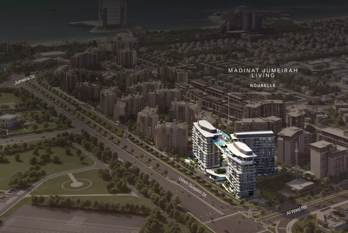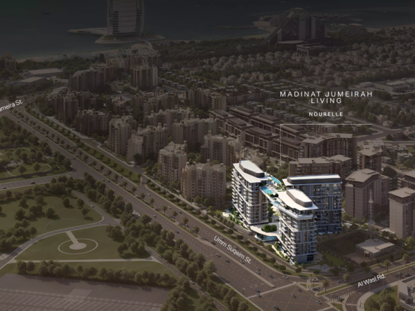 Nourelle is a premium residential development by Meraas Holding, located within the exclusive free-hold community of Madinat Jumeirah Living (MJL) in Umm Suqeim, Dubai. Zoned directly across from the iconic Burj Al Arab, the project comprises three interconnected towers linked by a signature sky-bridge elevated above landscaped terraces.