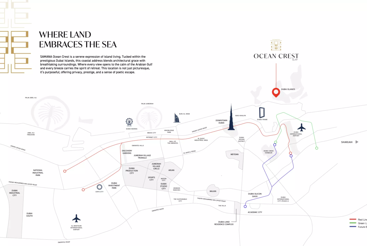 - Dubai Islands is positioned to offer both a serene island-style living environment and connection to Dubai’s central districts. It is a short drive from Dubai Creek, Deira, major road links and key amenities.