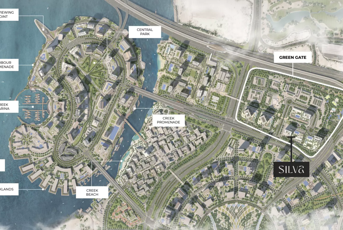 - Located within the Green Gate district of Dubai Creek Harbour—a low-density, green-focused community setting.